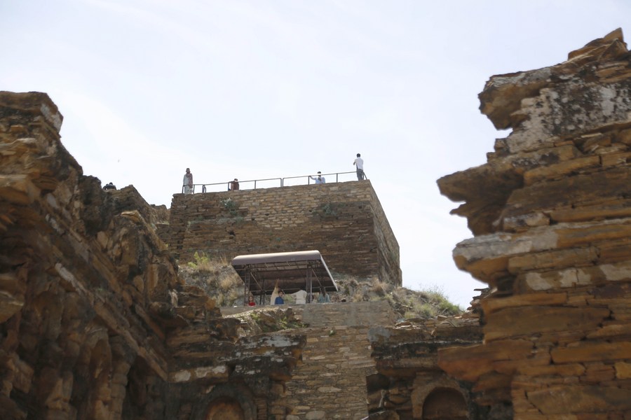 Tourists visit the archaeological site of the ancient Buddhist monastery Takht-i-Bahi, a UNESCO world heritage site, in northwest Pakistan's Mardan district, on May 5, 2024. (Xinhua/Ahmad Kamal)