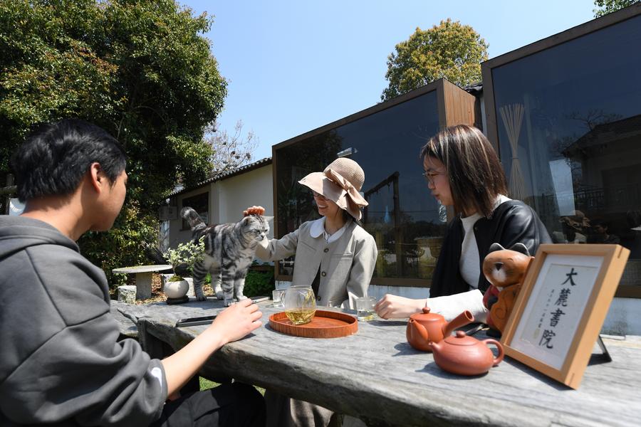 Tourists enjoy leisure time at a rural cultural tourism spot in Anji County, east China's Zhejiang Province, April 9, 2024. (Xinhua/Weng Xinyang)