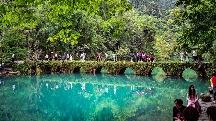 Tourists visit Xiaoqikong scenic area in Libo County, southwest China's Guizhou Province, May 16, 2024. (Xinhua/Tao Liang)