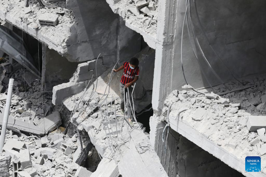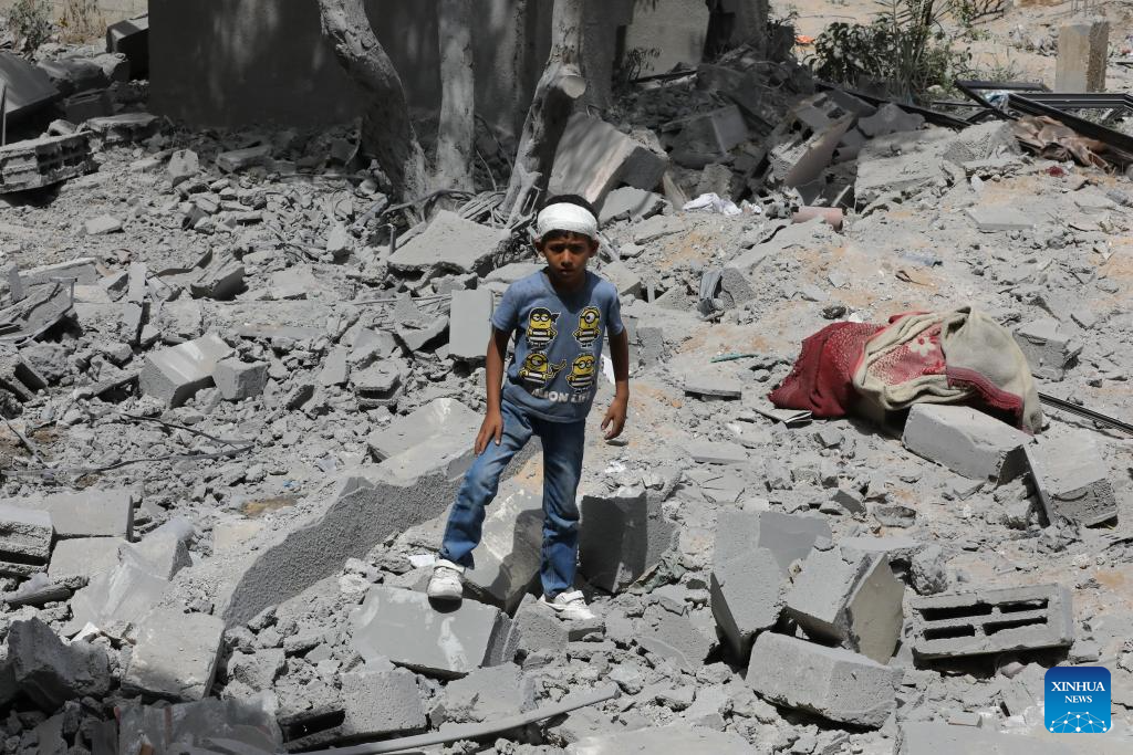 A Palestinian child stands on the rubble after an Israeli airstrike on the Nuseirat refugee camp in the central Gaza Strip, May 19, 2024. (Palestinian News Agency/Handout via Xinhua)