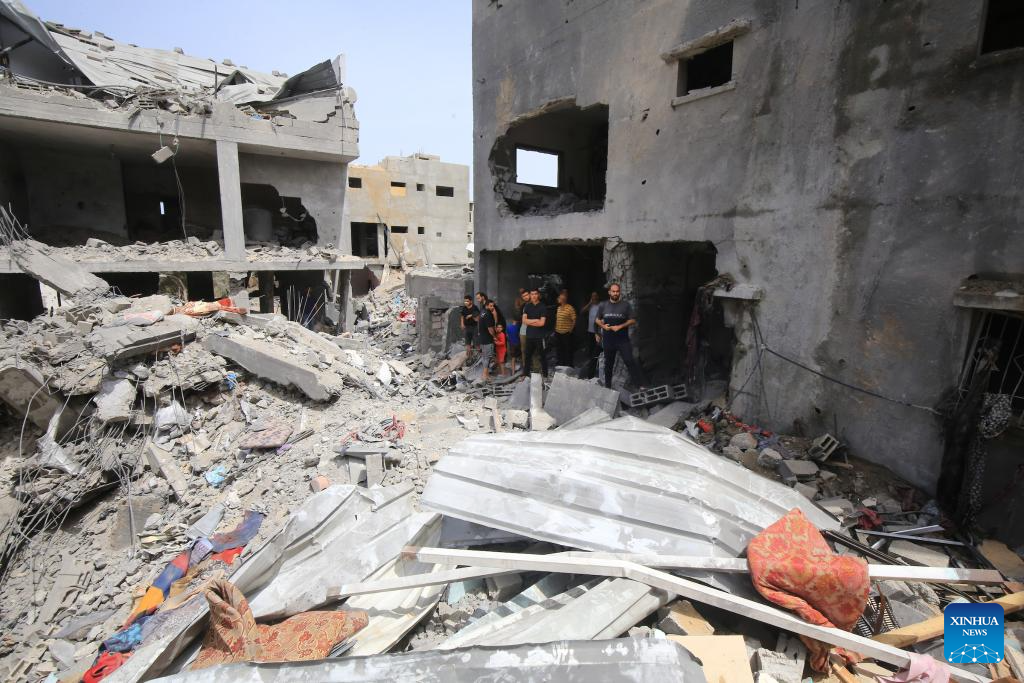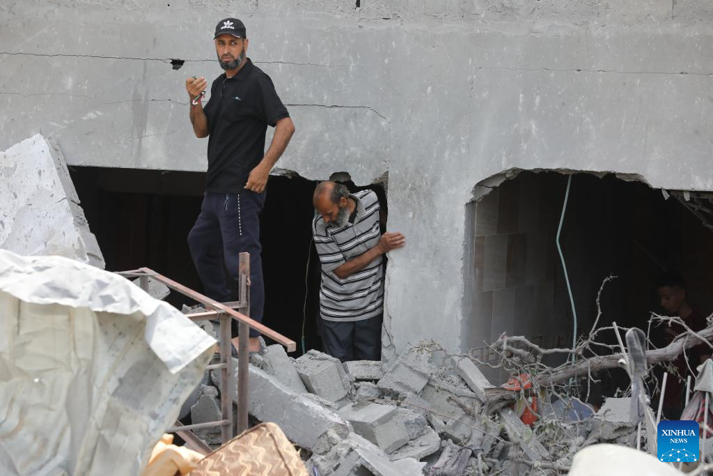 Palestinians inspect the rubble after an Israeli airstrike on the Nuseirat refugee camp in the central Gaza Strip, May 19, 2024. (Palestinian News Agency/Handout via Xinhua)