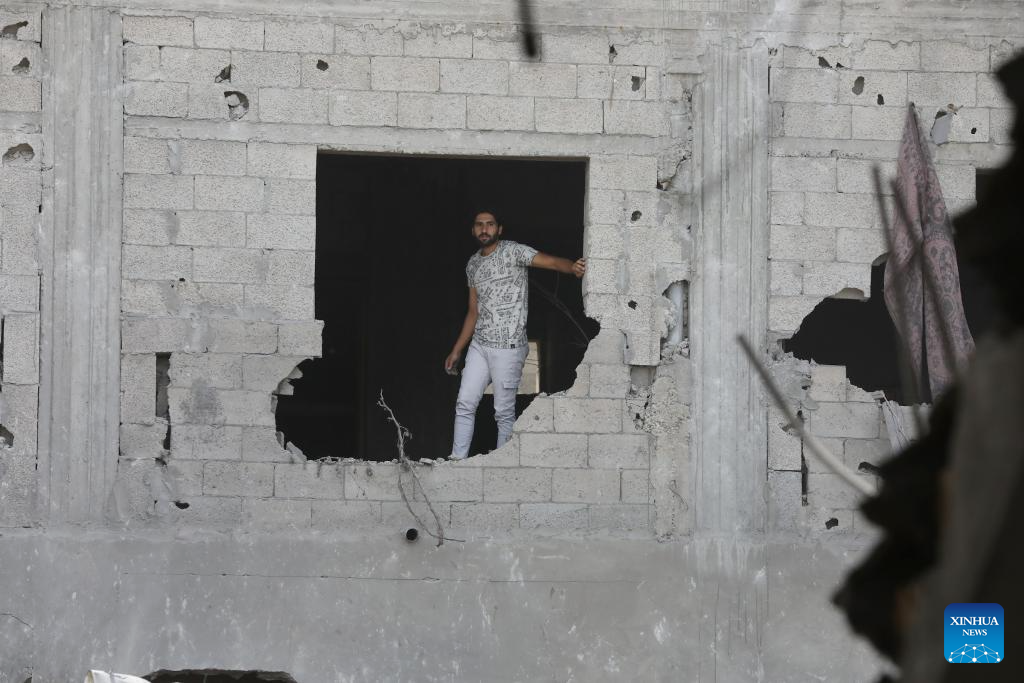 A Palestinian stands in a destroyed building after an Israeli airstrike on the Nuseirat refugee camp in the central Gaza Strip, May 19, 2024. (Palestinian News Agency/Handout via Xinhua)