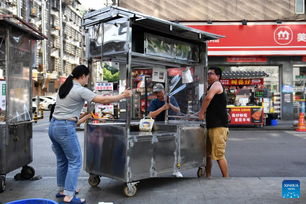 Zhang Yongsheng (R) moves his snack stall at Sifangping night market in Changsha, central China's Hunan Province, May 15, 2024. (Xinhua/Chen Zhenhai)