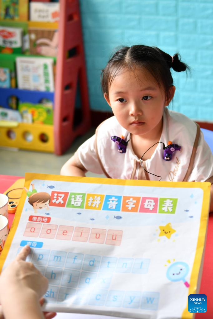 Daughter Zhang Yuhan attends a class at a hearing rehabilitation center in Changsha, central China's Hunan Province, May 16, 2024. (Xinhua/Chen Zhenhai)