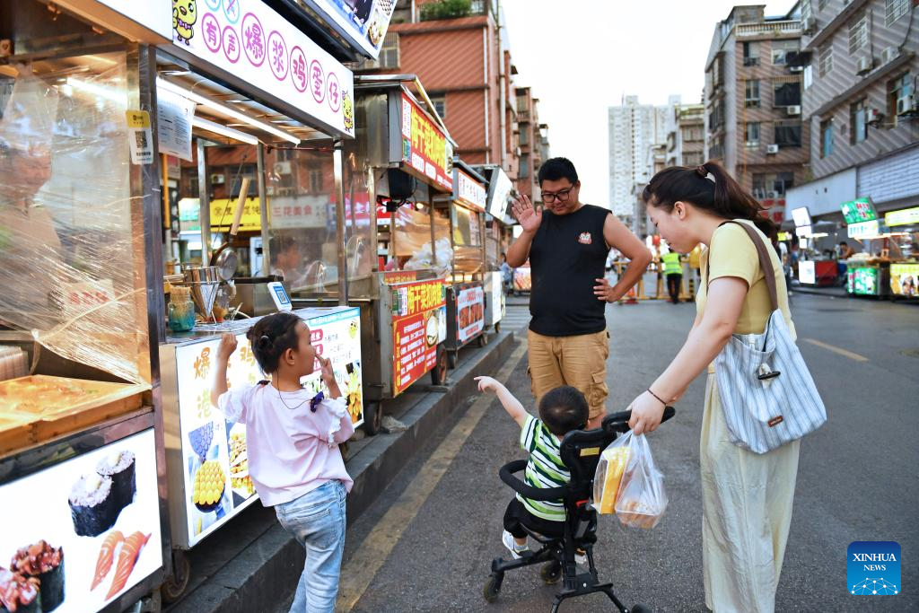 Zhang Yongsheng (C) greets a hearing-impaired child, a classmate of his daughter Zhang Yuhan (L) of a hearing rehabilitation center, at Sifangping night market in Changsha, central China's Hunan Province, May 15, 2024. (Xinhua/Chen Zhenhai)