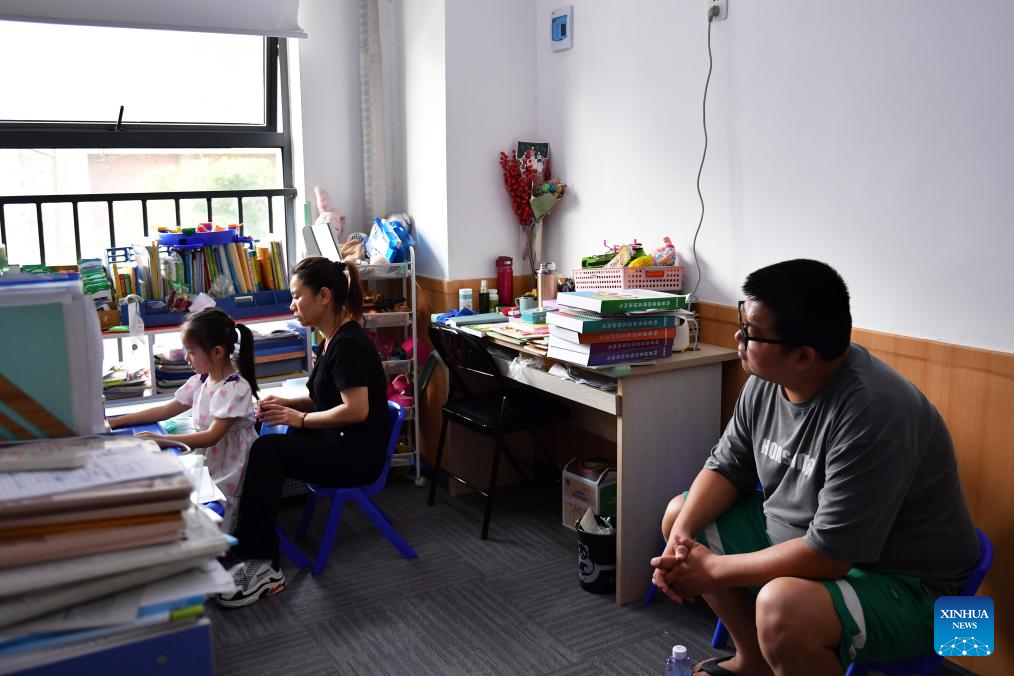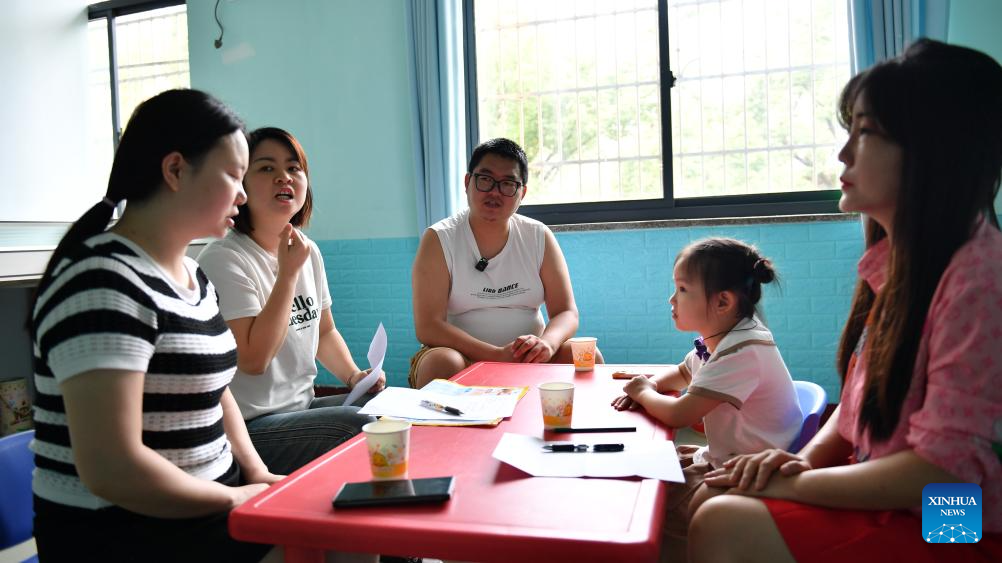 Daughter Zhang Yuhan (L) attends a class accompanied by his father Zhang Yongsheng (R) at a child development center in Changsha, central China's Hunan Province, May 17, 2024. (Xinhua/Chen Zhenhai)