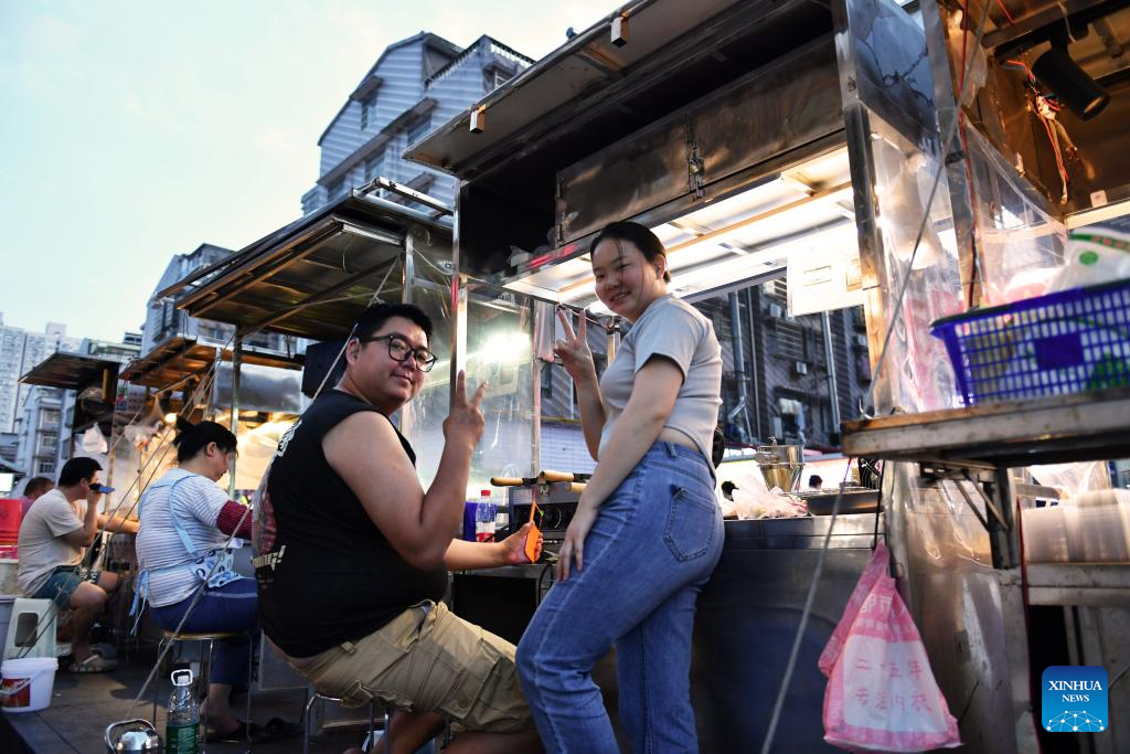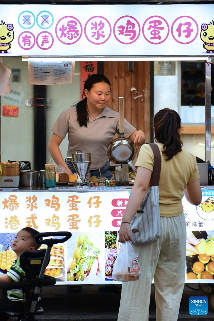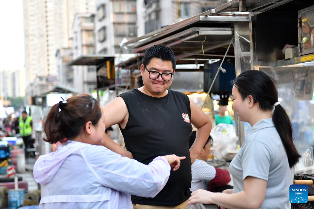 Zhan Jingwen (C) makes egg puffs for a customer at Sifangping night market in Changsha, central China's Hunan Province, May 15, 2024. (Xinhua/Chen Zhenhai)