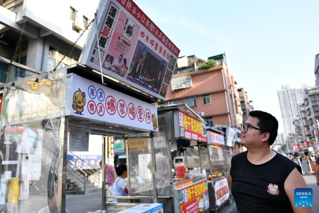 Zhang Yongsheng looks at the signboard on his snack stall at Sifangping night market in Changsha, central China's Hunan Province, May 15, 2024. (Xinhua/Chen Zhenhai)
