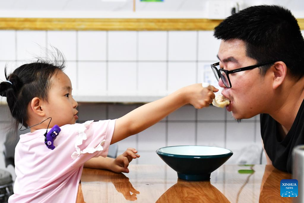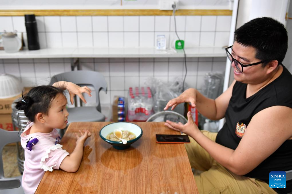 Daughter Zhang Yuhan interacts with her father Zhang Yongsheng during supper in Changsha, central China's Hunan Province, May 15, 2024. (Xinhua/Chen Zhenhai)