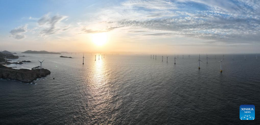 An aerial drone photo taken on May 17, 2024 shows an offshore wind farm operated by the China Three Gorges Corporation in Xinghua Bay, southeast China's Fujian Province. In recent years, Fujian has accelerated the development of clean energy, including wind and nuclear power, to promote the green and low-carbon development of the society. (Xinhua/Lin Shanchuan)