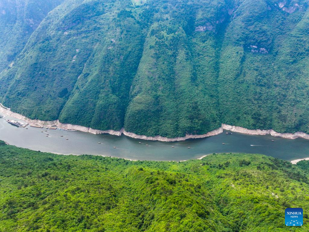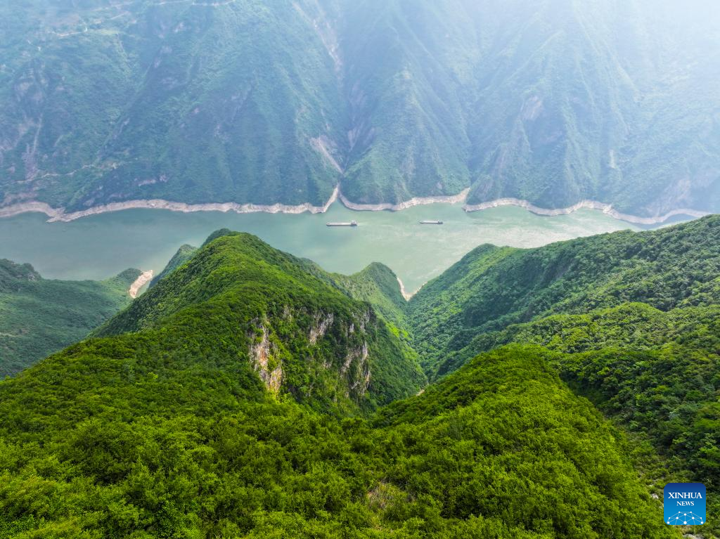 An aerial drone photo taken on May 16, 2024 shows the scenery of Wuxia Gorge, one of the Three Gorges on the Yangtze River, in Wushan County, southwest China's Chongqing Municipality. In recent years, taking cultural tourism industry as its strategic pillar industry, Wushan County has been promoting tourism centering on Three Gorges area. Multiple measures have also been implemented including establishing innovative tourism projects, improving tourism infrastructure to boost the high-quality development of tourism. (Xinhua/Wang Quanchao)