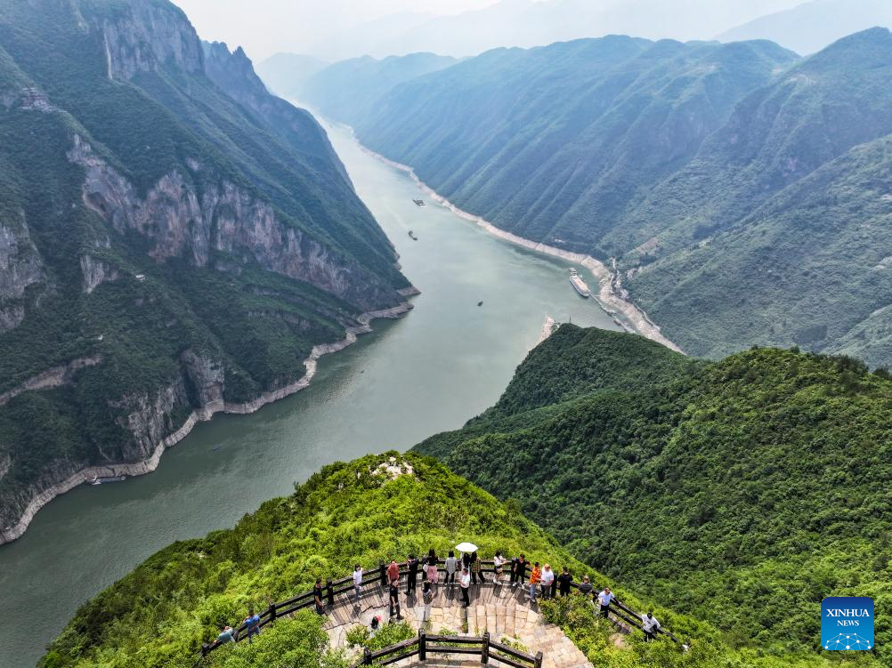 An aerial drone photo taken on May 16, 2024 shows tourists visiting a scenic area in Wushan County, southwest China's Chongqing Municipality. In recent years, taking cultural tourism industry as its strategic pillar industry, Wushan County has been promoting tourism centering on Three Gorges area. Multiple measures have also been implemented including establishing innovative tourism projects, improving tourism infrastructure to boost the high-quality development of tourism. (Xinhua/Wang Quanchao)