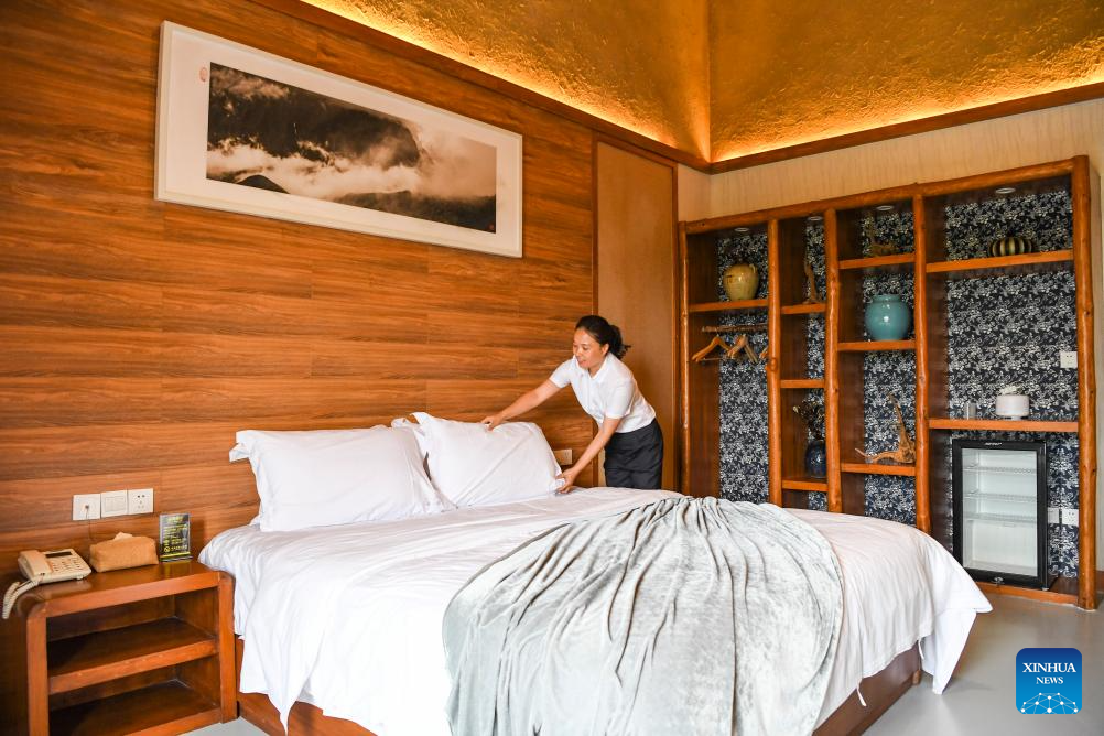 A staff member cleans a room at a homestay in Wushan County, southwest China's Chongqing Municipality, May 16, 2024. In recent years, taking cultural tourism industry as its strategic pillar industry, Wushan County has been promoting tourism centering on Three Gorges area. Multiple measures have also been implemented including establishing innovative tourism projects, improving tourism infrastructure to boost the high-quality development of tourism. (Xinhua/Wang Quanchao)