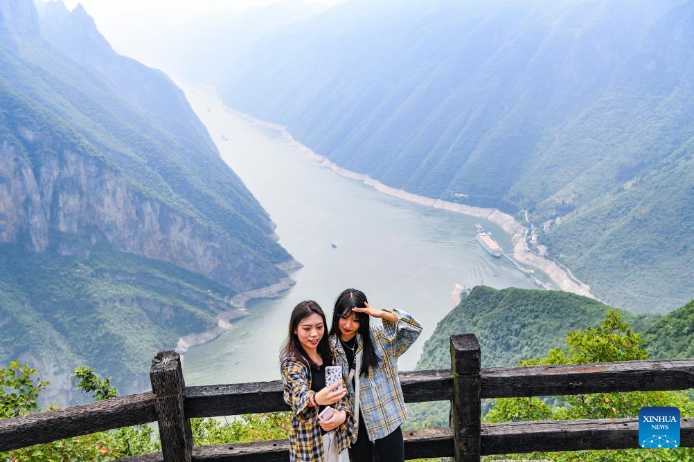 Tourists pose for photos at a scenic area in Wushan County, southwest China's Chongqing Municipality, May 16, 2024. In recent years, taking cultural tourism industry as its strategic pillar industry, Wushan County has been promoting tourism centering on Three Gorges area. Multiple measures have also been implemented including establishing innovative tourism projects, improving tourism infrastructure to boost the high-quality development of tourism. (Xinhua/Wang Quanchao)