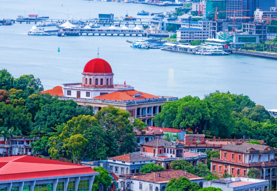 Photo shows an aerial view of Bagua Mansion, a red-domed landmark building that stands out against lush trees on the island of Gulangyu in Xiamen, southeast China's Fujian Province. (Photo/Yang Jingjian)