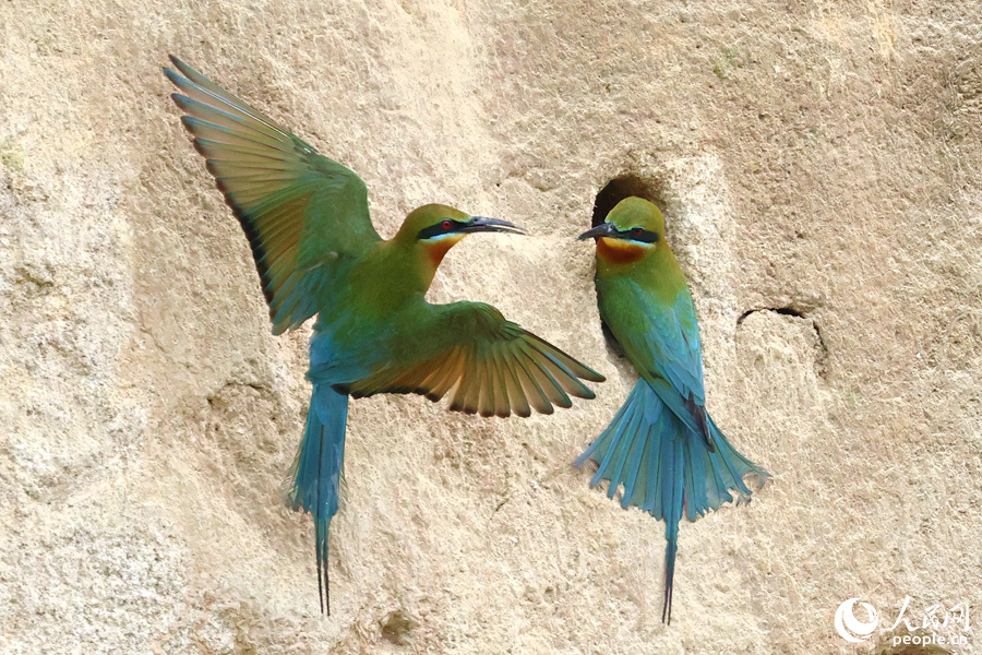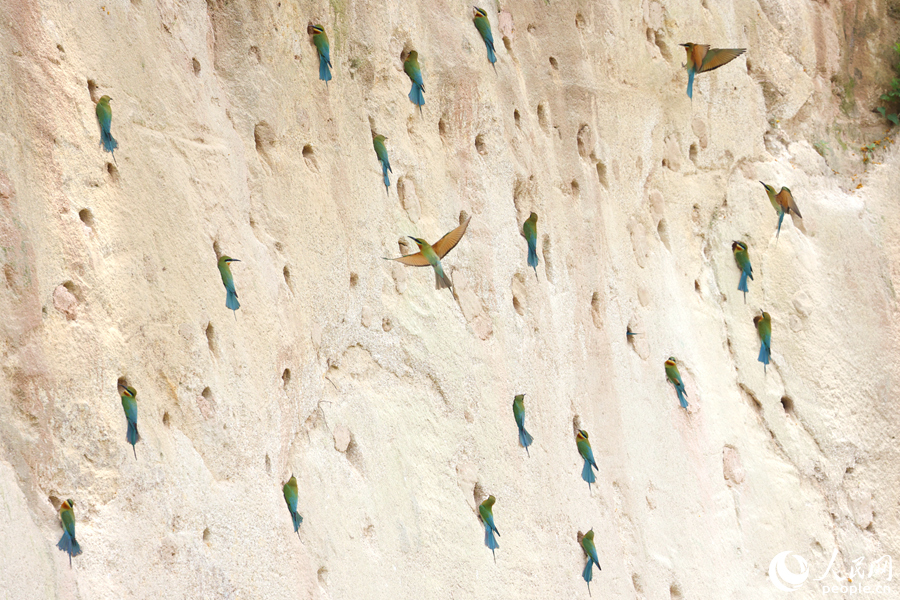Blue-tailed bee-eaters like to make their homes in holes on cliff faces. (People's Daily Online/Chen Bo)