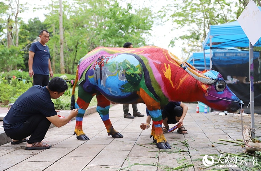 People paint on a buffalo's body. (People's Daily Online/Hu Zunhui)