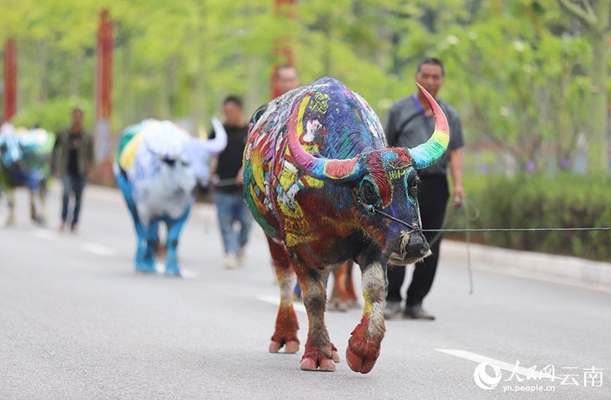 Buffaloes present paintings on their bodies. (People's Daily Online/Hu Zunhui)
