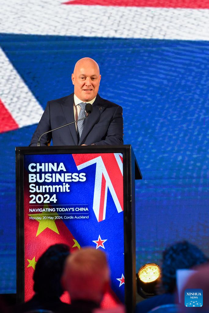 New Zealand Prime Minister Christopher Luxon speaks at the China Business Summit 2024 in Auckland, New Zealand, May 20, 2024. (Xinhua/Guo Lei)