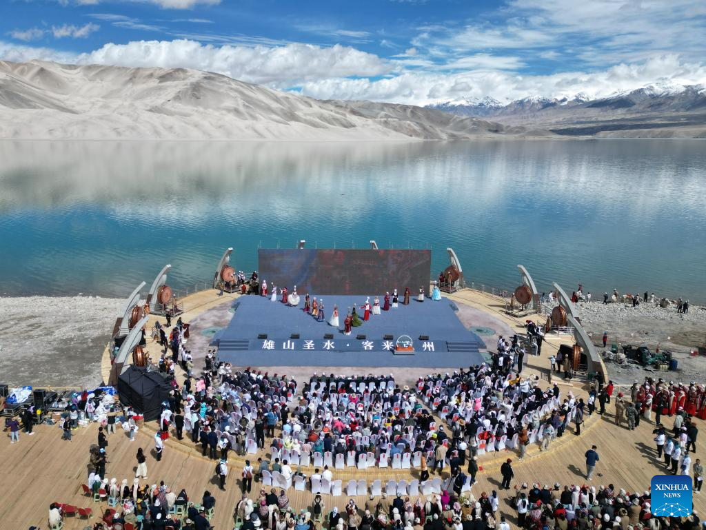An aerial drone photo taken on May 19, 2024 shows dancers performing at the opening event for the China Tourism Day at the Baisha Lake scenic area in Akto County, northwest China's Xinjiang Uygur Autonomous Region. May 19 marks the China Tourism Day. (Xinhua/Yin Xingyu)