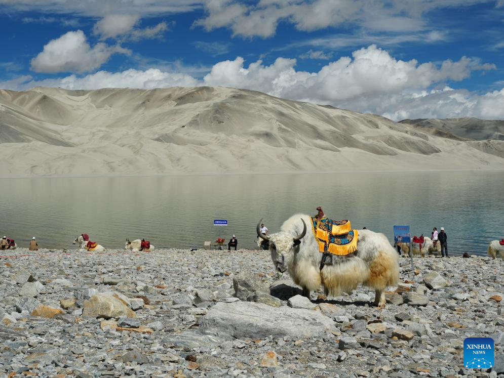 People visit the Baisha Lake scenic area in Akto County, northwest China's Xinjiang Uygur Autonomous Region, May 19, 2024. May 19 marks the China Tourism Day. (Xinhua/Yin Xingyu)