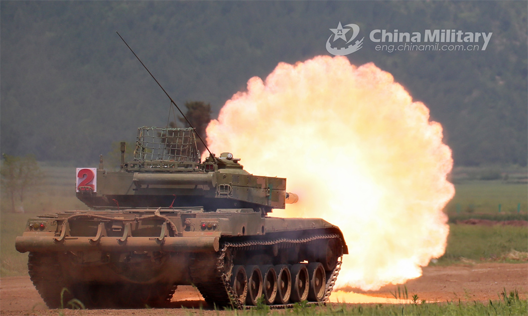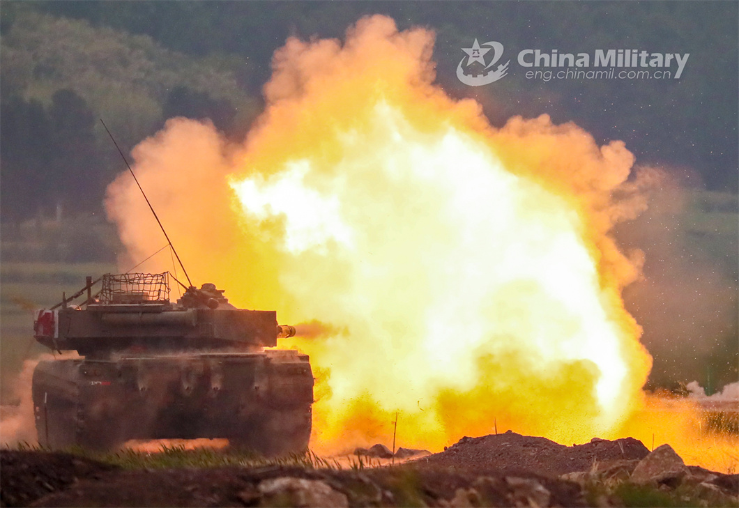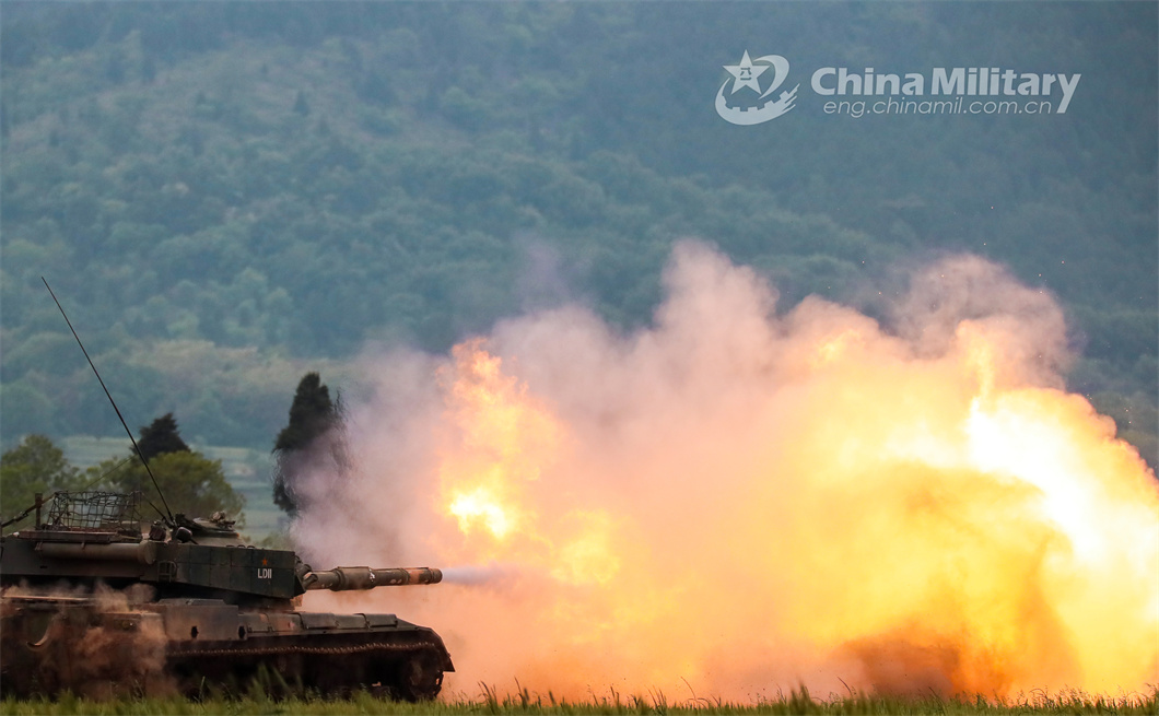 A main battle tank (MBT) attached to an armored detachment under the PLA 71st Group Army spits fire at mock targets during a live-fire shooting training exercise in early May 2024. (eng.chinamil.com.cn/Photo by Liao Zhenxiong)