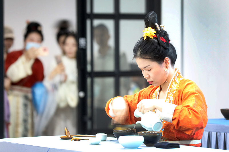 A girl in traditional dress makes tea at a tea art competition. (Photo/CFP)
