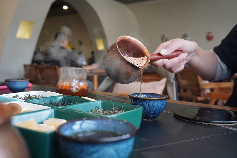 A tourist makes Guanguan tea, usually brewed in a clay pot, in Lanzhou, northwest China's Gansu Province. (Photo/CNS)