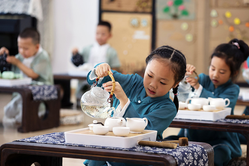 Young kids experience tea art at a kindergarten in Huzhou, southeast China's Zhejiang Province. (Photo/CFP)