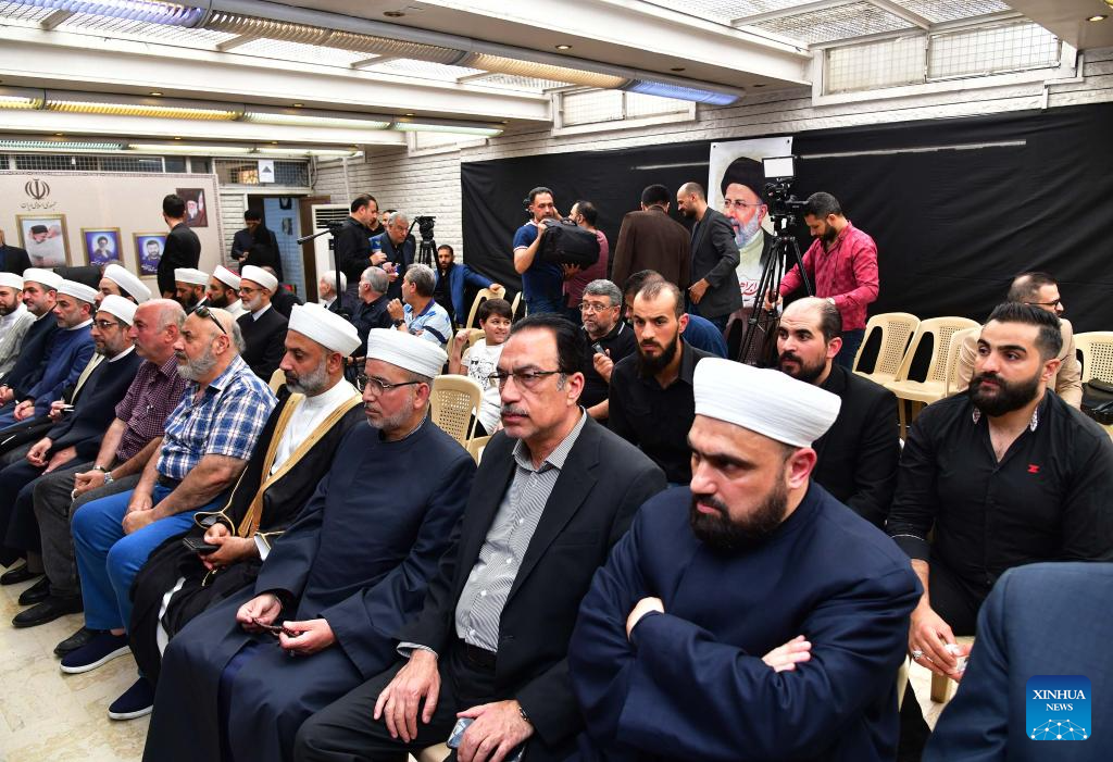 Iranian embassy in Syria holds a memorial service in Damascus, Syria, for the victims of the helicopter crash near Varzaqan County, Iran, on May 21, 2024. Iranian President Ebrahim Raisi and some members of his accompanying team, including Foreign Minister Hossein Amir-Abdollahian, were confirmed dead Monday morning as the wreckage of the helicopter carrying them was found following its crash in bad weather on Sunday near Varzaqan County, some 670 km away from Tehran. (Photo by Ammar Safarjalani/Xinhua)