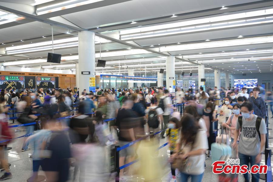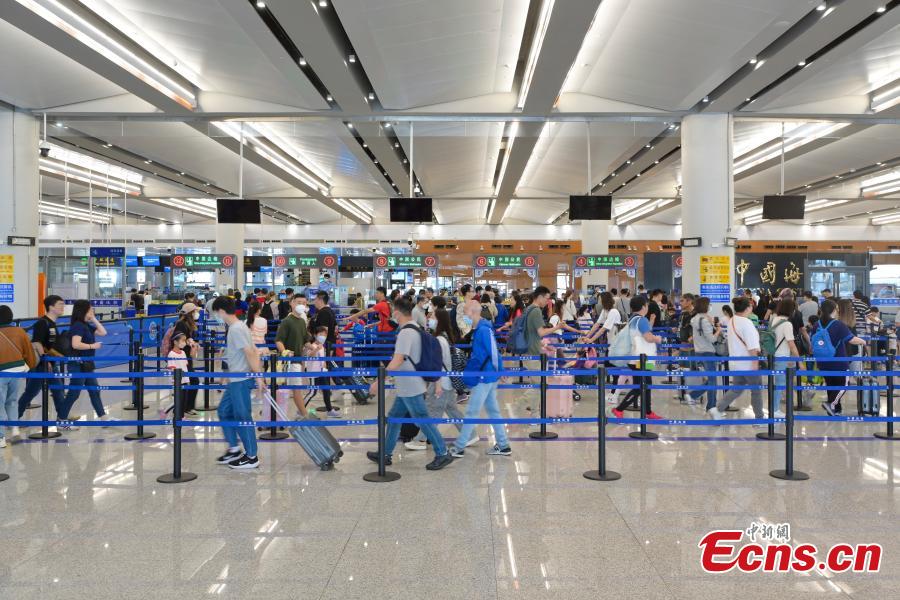 Photo taken on March 30, 2024, shows visitors queuing to pass a customs checkpoint at Zhuhai Port, south China's Guangdong Province. (Photo: China News Service/Chen Jimin)