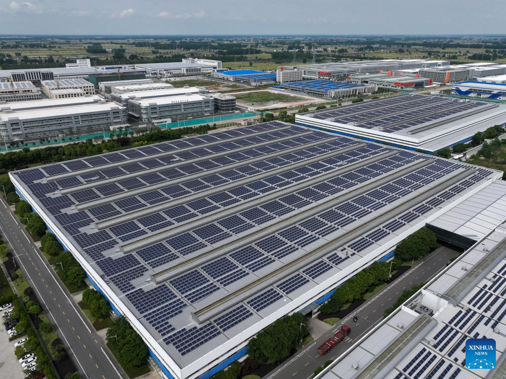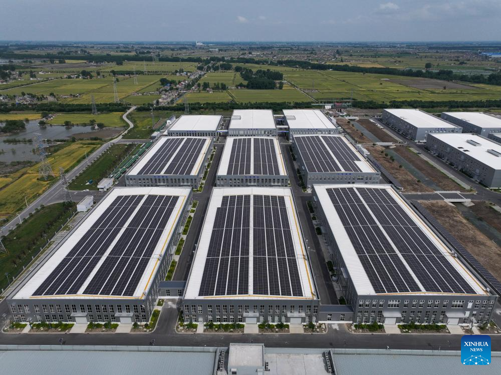 An aerial drone photo taken on May 21, 2024 shows solar panels on the roof of a plant at an industrial park in Yangzhou, east China's Jiangsu Province. In recent years, the city of Yangzhou has been boosting the construction of clean energy projects to promote the green development. (Xinhua/Li Bo)