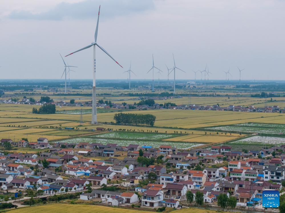 An aerial drone photo taken on May 21, 2024 shows a wind power project in Baoying County of Yangzhou, east China's Jiangsu Province. In recent years, the city of Yangzhou has been boosting the construction of clean energy projects to promote the green development. (Xinhua/Li Bo)