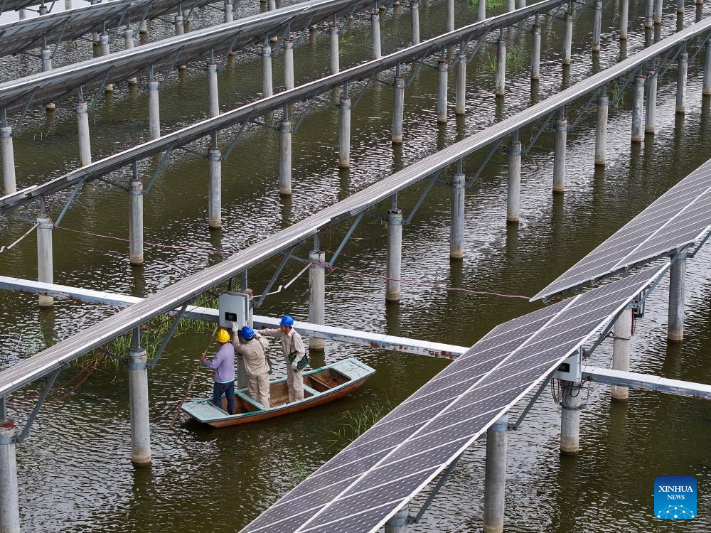 An aerial drone photo taken on May 21, 2024 shows power supply workers patrolling at a photovoltaic power project in Yangzhou, east China's Jiangsu Province. In recent years, the city of Yangzhou has been boosting the construction of clean energy projects to promote the green development. (Xinhua/Li Bo)
