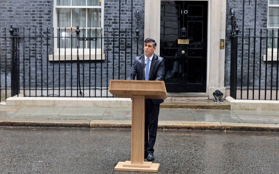 British Prime Minister Rishi Sunak speaks outside 10 Downing Street in London, Britain, on May 22, 2024. (Xinhua)