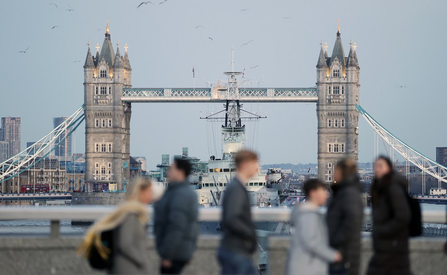 People walk on the London Bridge in London, Britain, Jan. 28, 2024. (Xinhua/Li Ying)