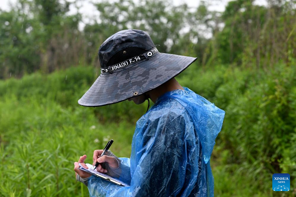 A surveyor keeps a record during a survey at Changle area in Anhui Yangtze alligator national nature reserve, Nanling county of Wuhu City, east China's Anhui Province, May 21, 2024. (Xinhua/Huang Bohan)