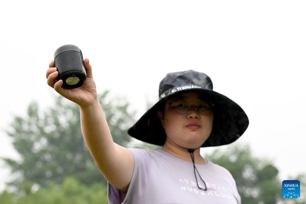 A surveyor raises a loudspeaker that repeats the voices of Yangtze alligators as a way to attract the reptile during a survey at Changle area in Anhui Yangtze alligator national nature reserve, Nanling county of Wuhu City, east China's Anhui Province, May 21, 2024. (Xinhua/Huang Bohan)
