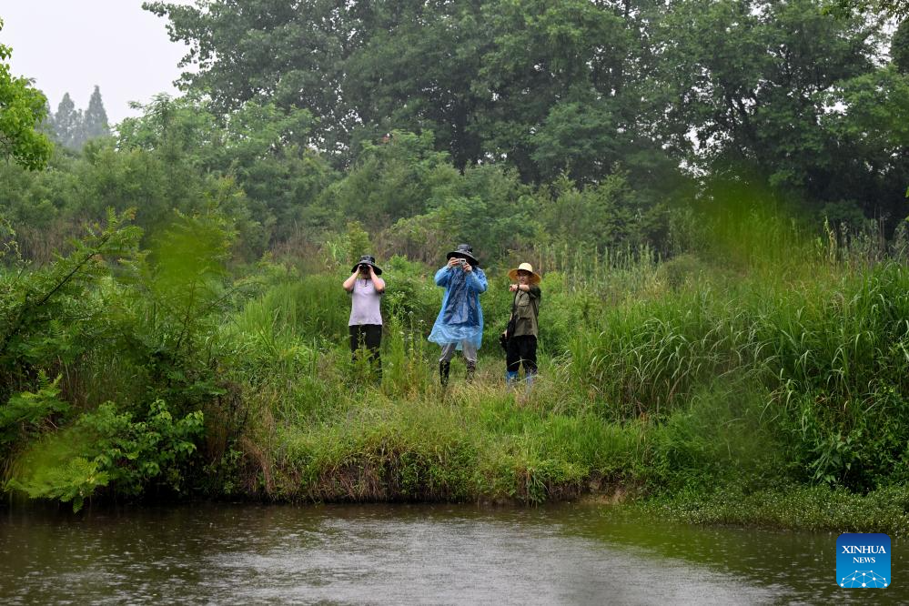 Surveyors look for traces of Yangtze alligators at Changle area in Anhui Yangtze alligator national nature reserve, Nanling county of Wuhu City, east China's Anhui Province, May 21, 2024. (Xinhua/Huang Bohan)