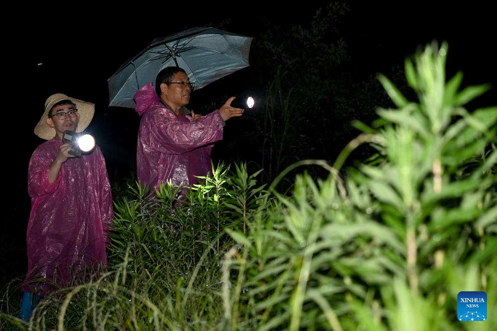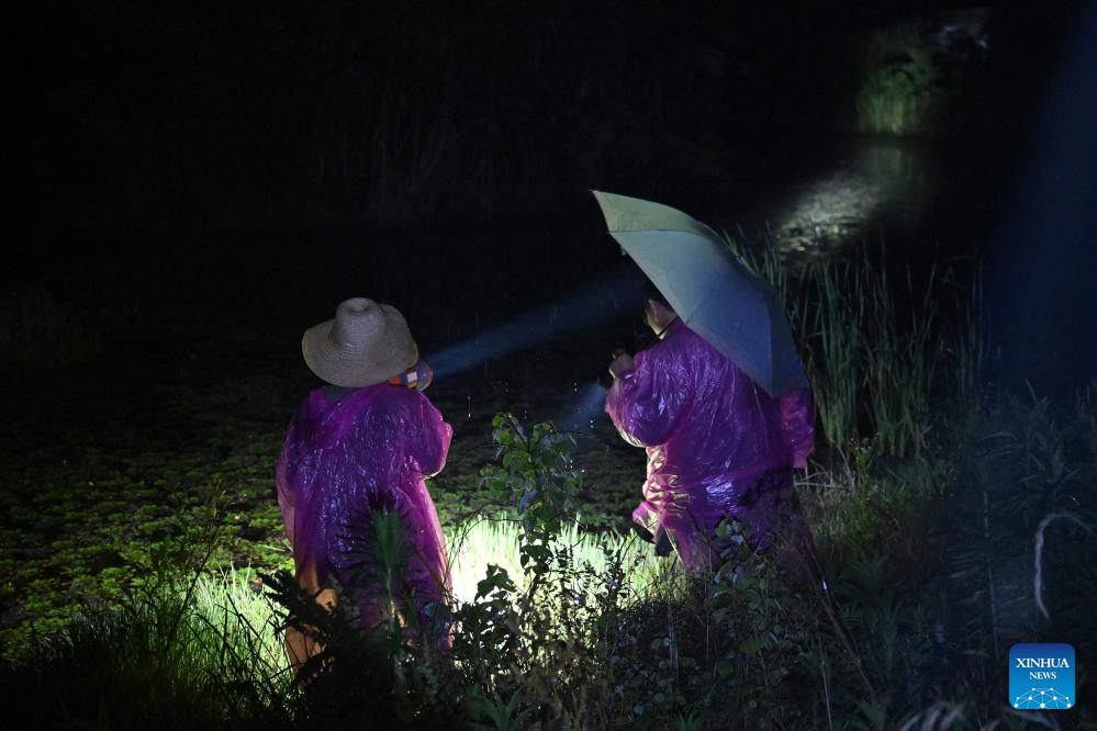 Surveyors search for Yangtze alligators at Changle area in Anhui Yangtze alligator national nature reserve, Nanling county of Wuhu City, east China's Anhui Province, May 21, 2024. (Xinhua/Huang Bohan)