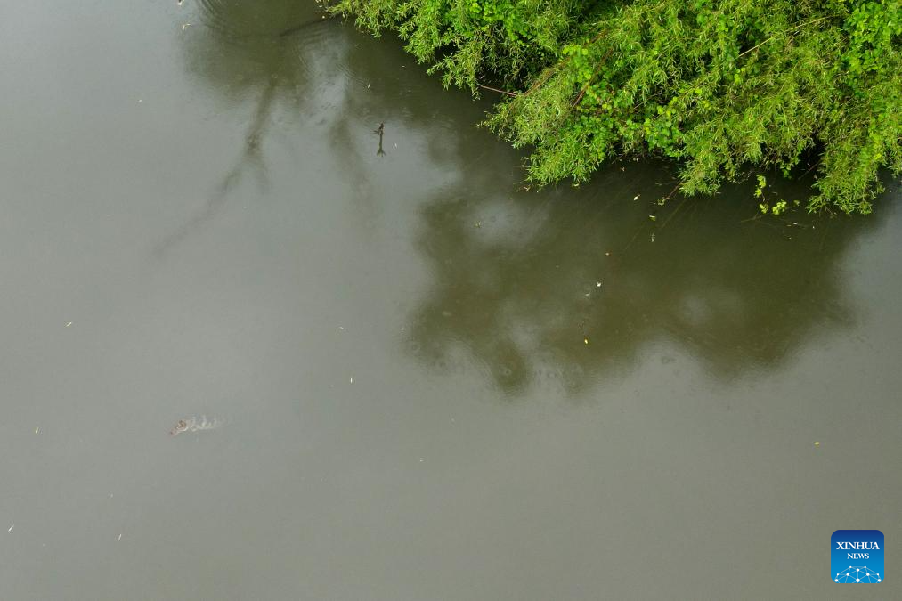A drone photo taken on May 21, 2024 shows a Yangtze alligator in Changle area in Anhui Yangtze alligator national nature reserve, Nanling county of Wuhu City, east China's Anhui Province. (Xinhua/Huang Bohan)