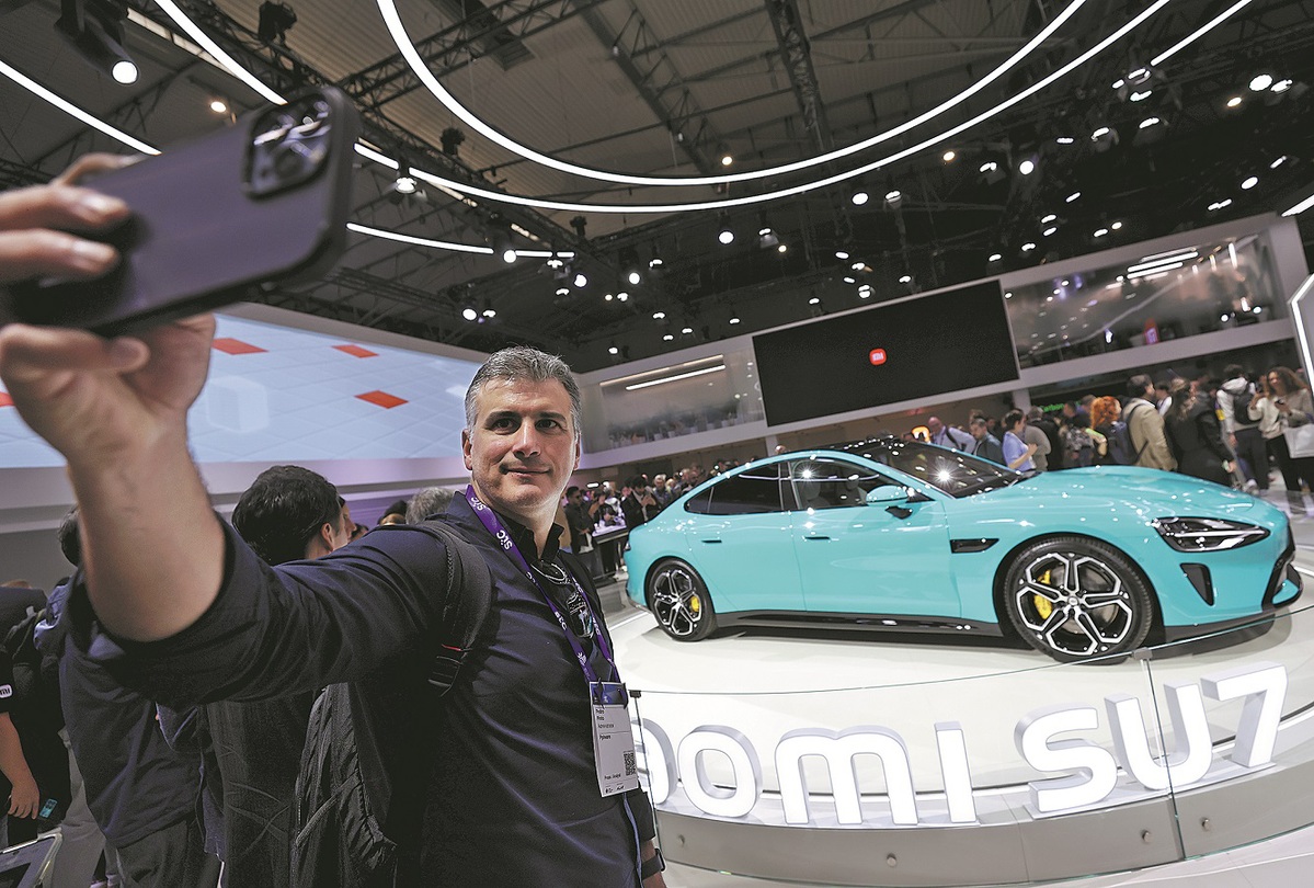 A visitor takes a selfie with Xiaomi's SU7 displayed at the Mobile World Congress 2024 in Barcelona, Spain, in February. GAO JING/XINHUA