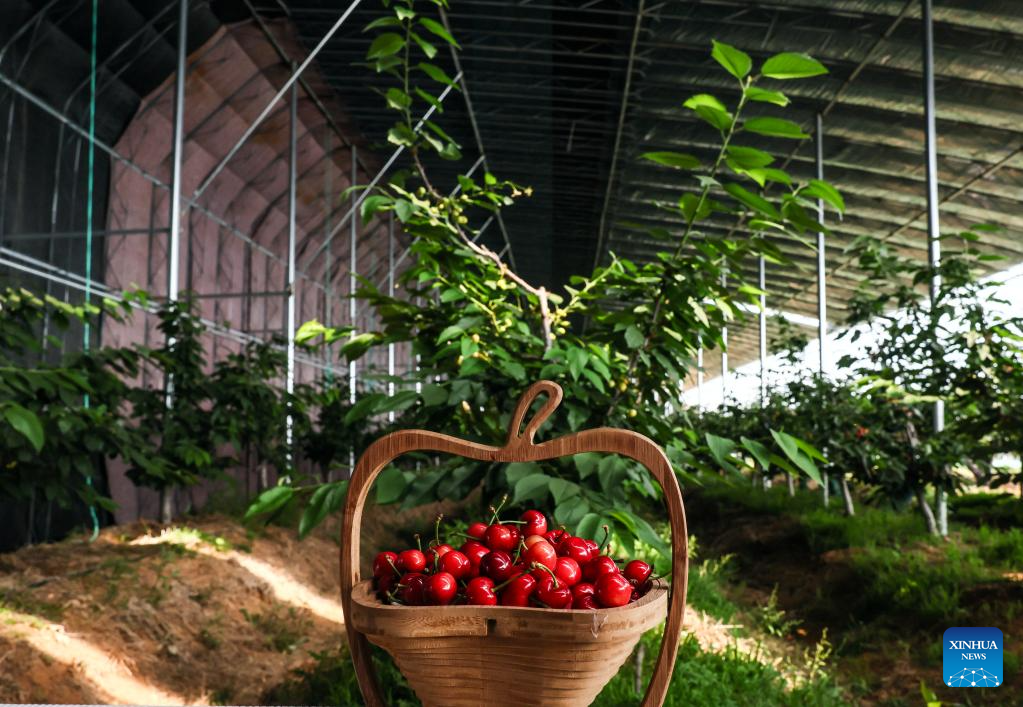 This photo taken on May 22, 2024 shows cherries at a farm in Nanhu Town of Rizhao City, east China's Shandong Province. Relying on its natural scenery and convenient transportation, Nanhu Town of Rizhao City has been vigorously developing ecological tourism featuring fruits-picking tours and agritainment in recent years. Agricultural farms for leisure see increasing popularity among tourists and locals. (Photo by Lan Hongguang/Xinhua)