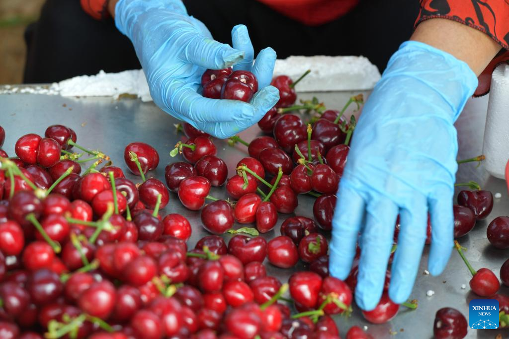 A worker sorts freshly picked cherries at a farm in Nanhu Town of Rizhao City, east China's Shandong Province, May 22, 2024. Relying on its natural scenery and convenient transportation, Nanhu Town of Rizhao City has been vigorously developing ecological tourism featuring fruits-picking tours and agritainment in recent years. Agricultural farms for leisure see increasing popularity among tourists and locals. (Xinhua/Meng Tao)