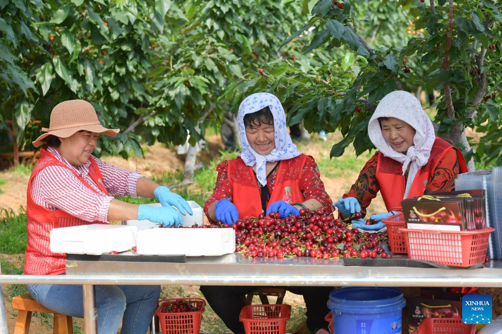 Workers sort and pack freshly picked cherries at a farm in Nanhu Town of Rizhao City, east China's Shandong Province, May 22, 2024. Relying on its natural scenery and convenient transportation, Nanhu Town of Rizhao City has been vigorously developing ecological tourism featuring fruits-picking tours and agritainment in recent years. Agricultural farms for leisure see increasing popularity among tourists and locals. (Xinhua/Meng Tao)