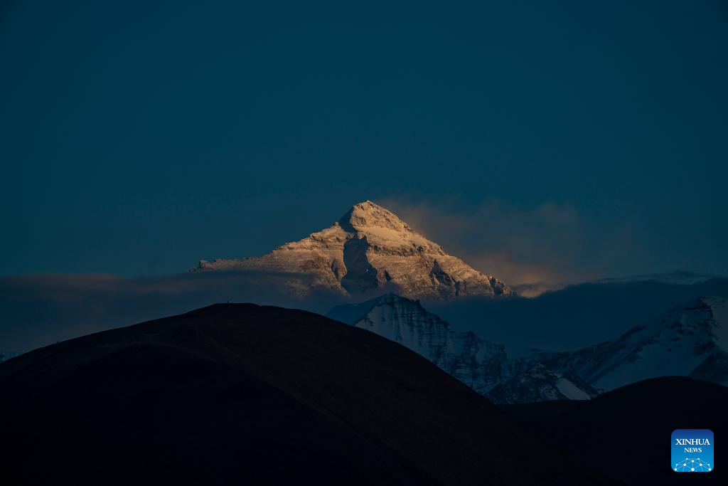 This photo taken on May 19, 2024 from Zhaxizom Township in Tingri County of Xigaze City in southwest China's Xizang Autonomous Region shows a view of Mount Qomolangma at sunset. (Xinhua/Sun Fei)