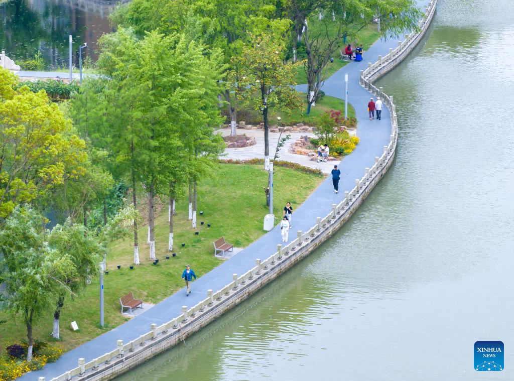 People take a walk at a scenic belt along the Liangxi River in Wuxi, east China's Jiangsu Province, May 22, 2024. Wuxi city is building a scenic belt along the Liangxi River in recent years to provide its local people with leisure space. (Photo by Zhong Xueman/Xinhua)