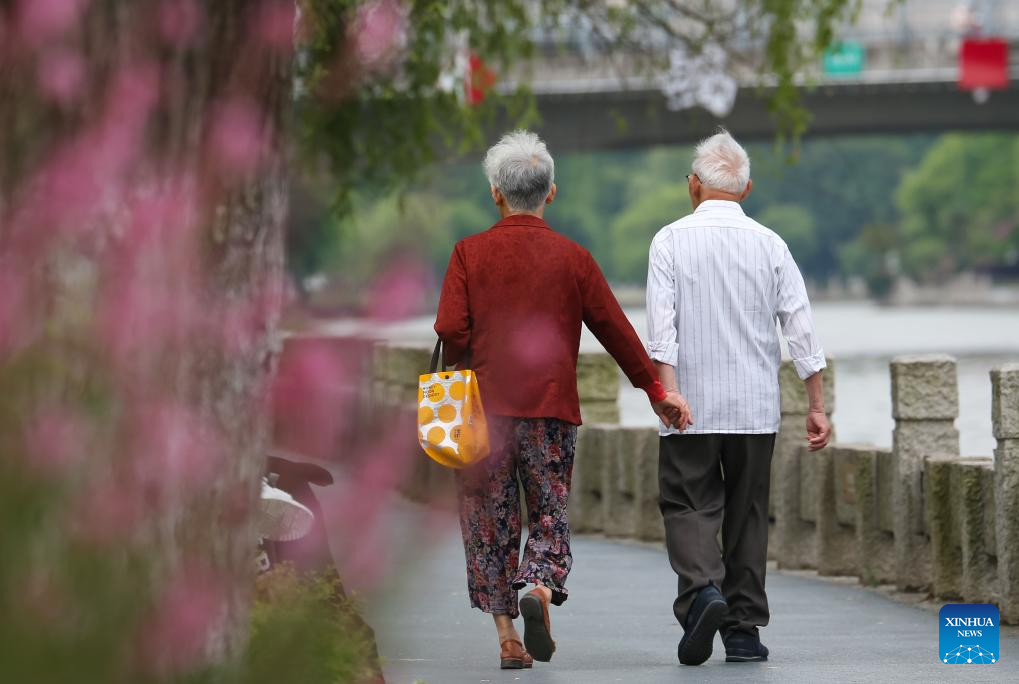 People walk with baby strollers at a scenic belt along the Liangxi River in Wuxi, east China's Jiangsu Province, May 22, 2024. Wuxi city is building a scenic belt along the Liangxi River in recent years to provide its local people with leisure space. (Photo by Gu Jihong/Xinhua)