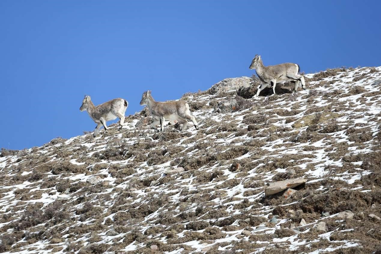 Blue sheep forage on a peak of the Qilian Mountains, northwest China's Qinghai province, after a snow, on March 2, 2024. (People's Daily Online/Jiang Aiping)