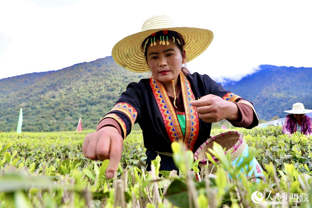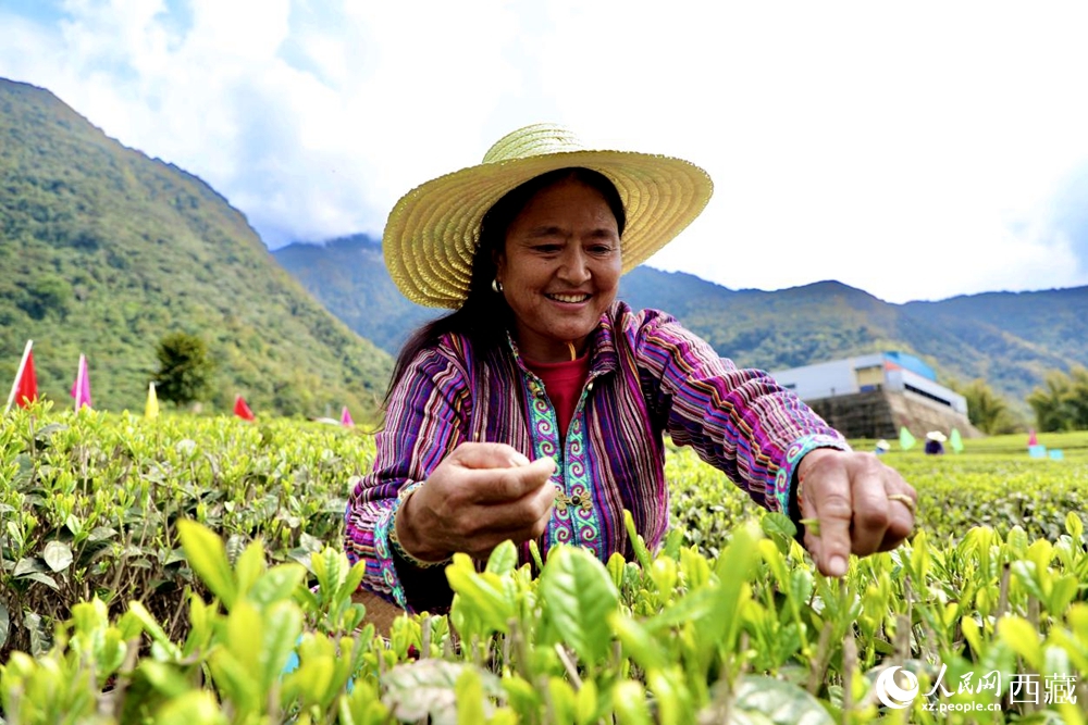 A farmer picks tea leaves in Metok county, Nyingchi city, southwest China's Xizang Autonomous Region. (People's Daily Online/Tsering Norbu)
